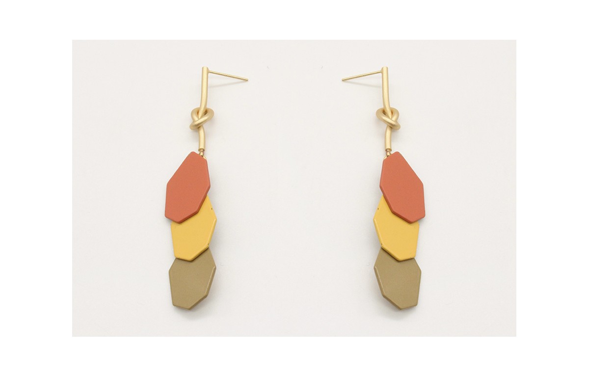 Pendientes perno nudo largo oro mate con piezas esmaltadas mostazas,visón,coral. Largo 7cm.