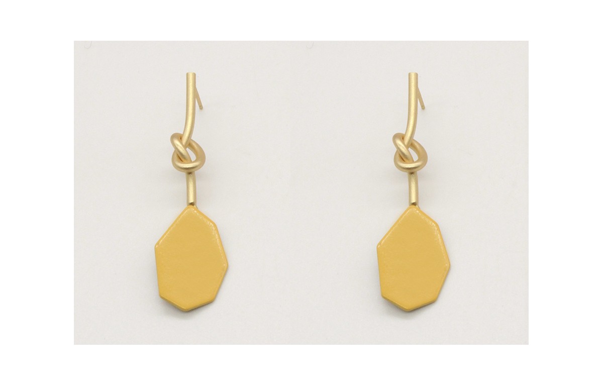 Pendiente nudo largo en oro mate con pieza esmaltada mostaza. Largo 4,5cm.