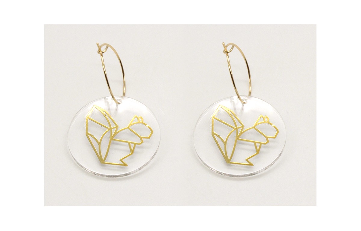 Pendientes aro oro brillo con disco metacrilato ardilla dorado. Largo 5cm.