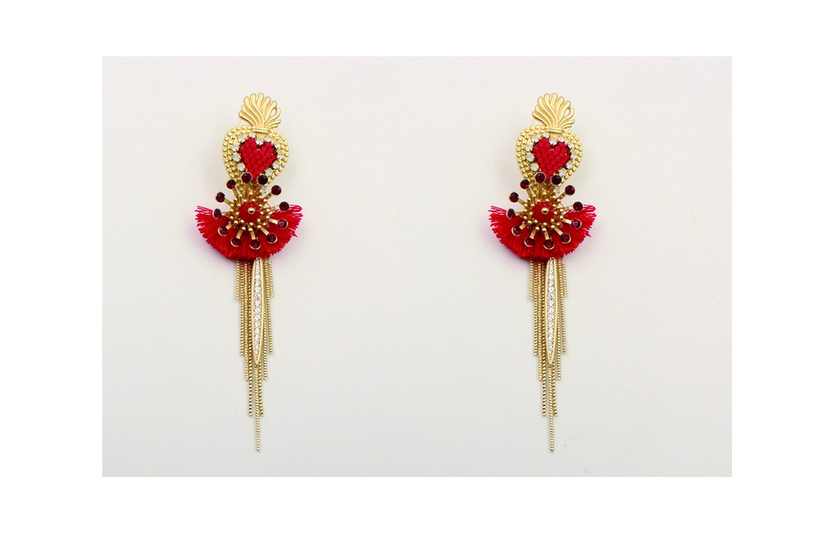Pendientes perno sagrado corazón con fleco rojo,daga strass cristal,flecos oro mate, roseton strass granate. Largo 10cm.