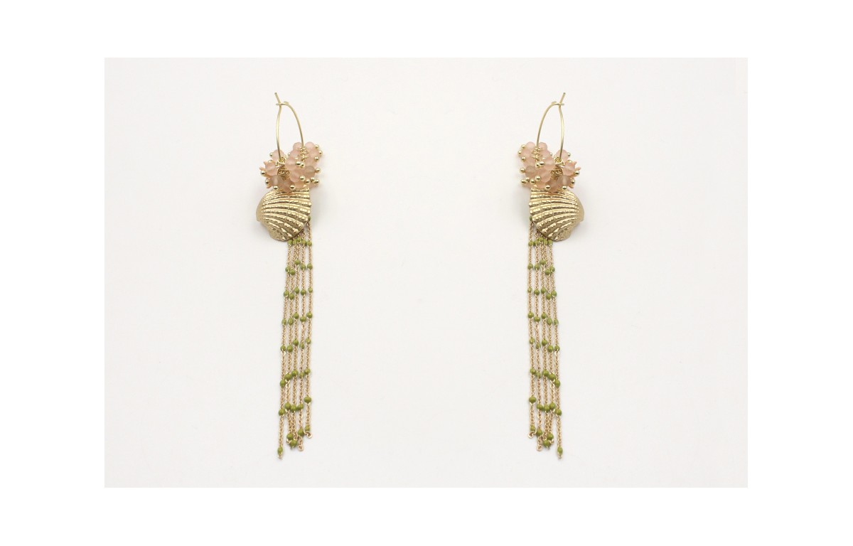 Pendientes aro oro mate con facetadas rositas, almeja oro, estrella coral esmaltada salmón y fleco cadena bola esmaltada verde. Largo 12cm.