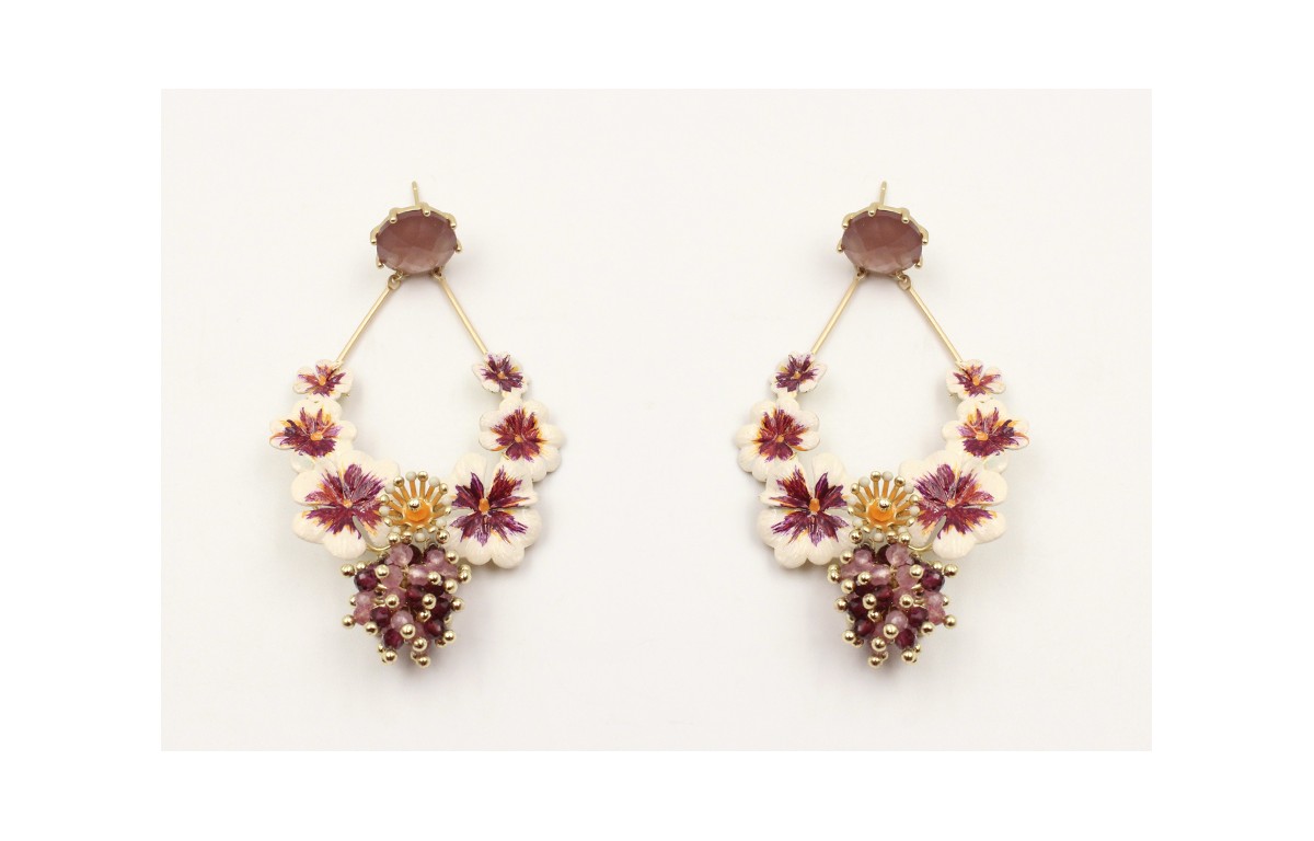 Pendientes perno brillo morado opal, trio flores blanca y morado, burrruño bolas moradas. Largo 8cm.