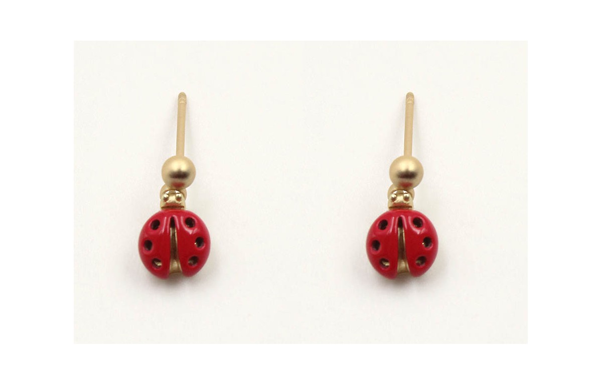 Pendientes perno polita oro mate con mariquita esmaltada roja. Largo 1,5cm.