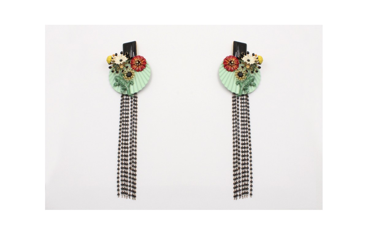 Pendientes perno rectangulo esmaltado negro, pieza ondulada turquesa con flores, lagarto y fleco cadena miyuki negra. Largo 13,5cm.