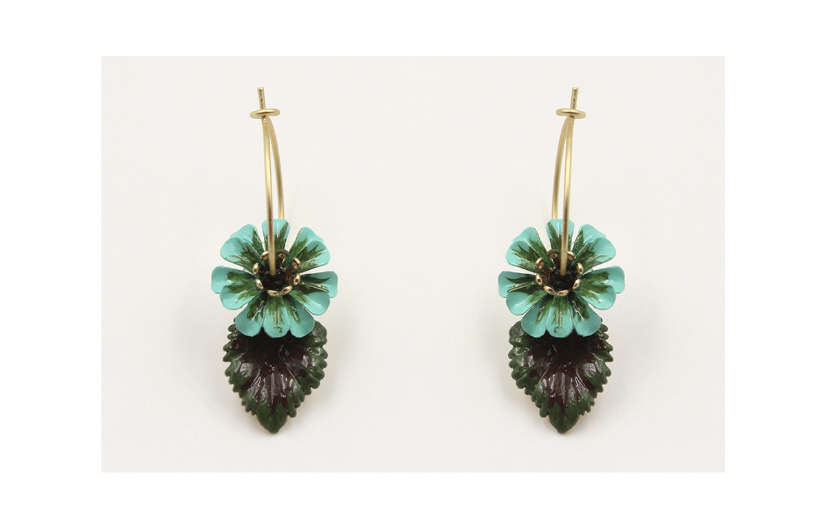 Pendientes aro oro mate con flor esmalte azul y verde colgante hoja esmalte verde