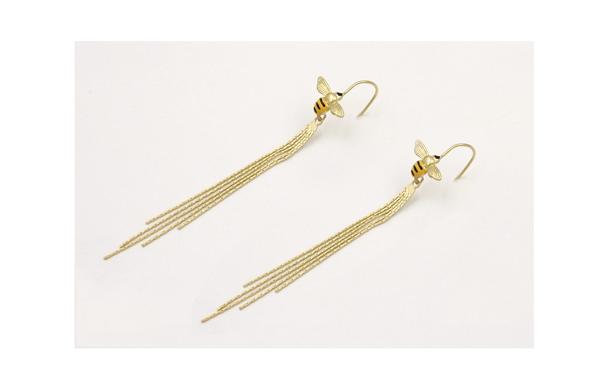 Pendientes perno abeja esmaltada negra y amarilla con fleco de 5 tiras. Largo 8cm.
