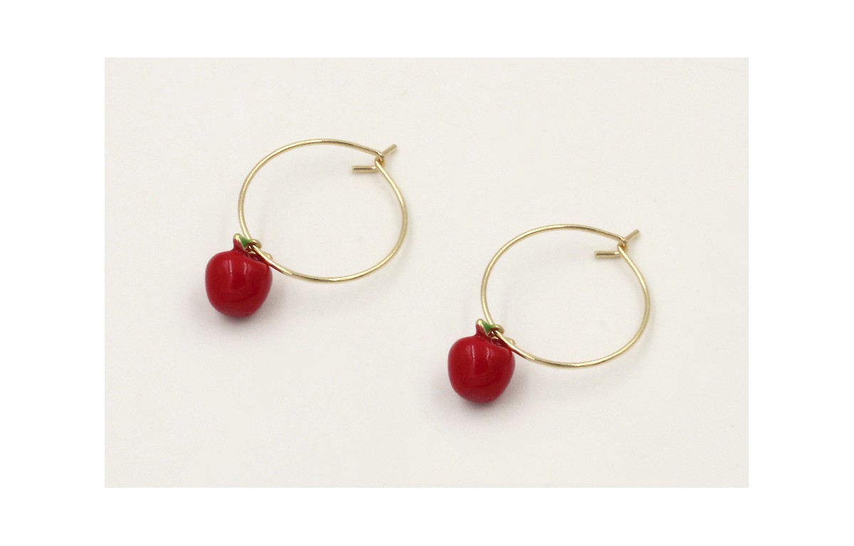 Pendientes aro dorado con manzanas esmaltadas rojas y verde. Largo 2,5cm.