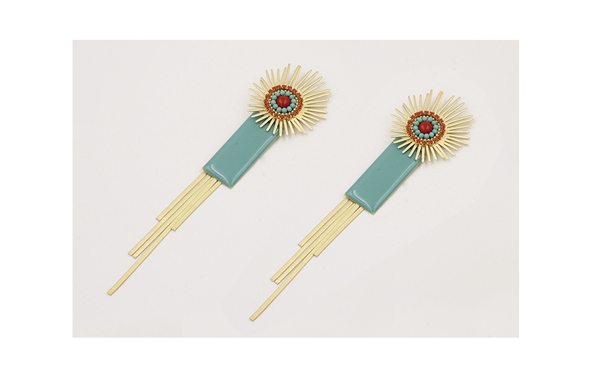 Pendientes perno sol con strass coral,bolitas turquesa colgante rectangulo esmaltado azul piedra y fleco dorado mate. Largo 13cm.