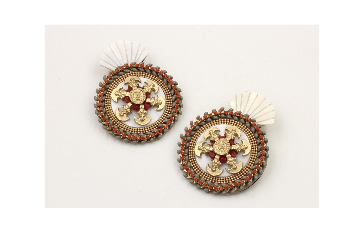Pendientes perno concha triangular nacar colgante redondo con colgante media luna, sol y cadena de petalos grises y strass coral. Largo 9cm.