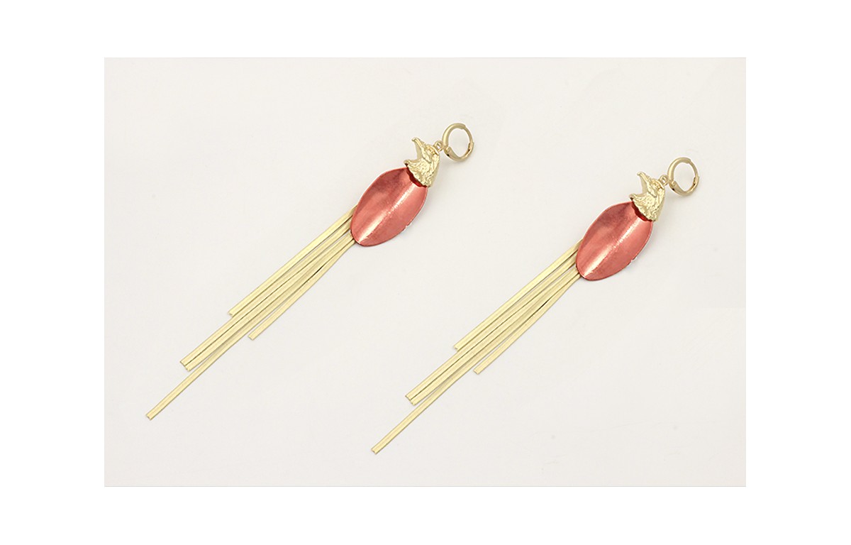 Pendientes cierre de seguridad colgante cabeza hueca de aguila, lamina aluminio rojo metalizado y fleco 5 tiras. Largo 14cm.