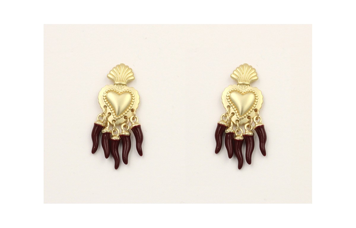 Pendientes sagrado corazón dorado mate con pimientos esmaltados rojo. Largo 3cm.