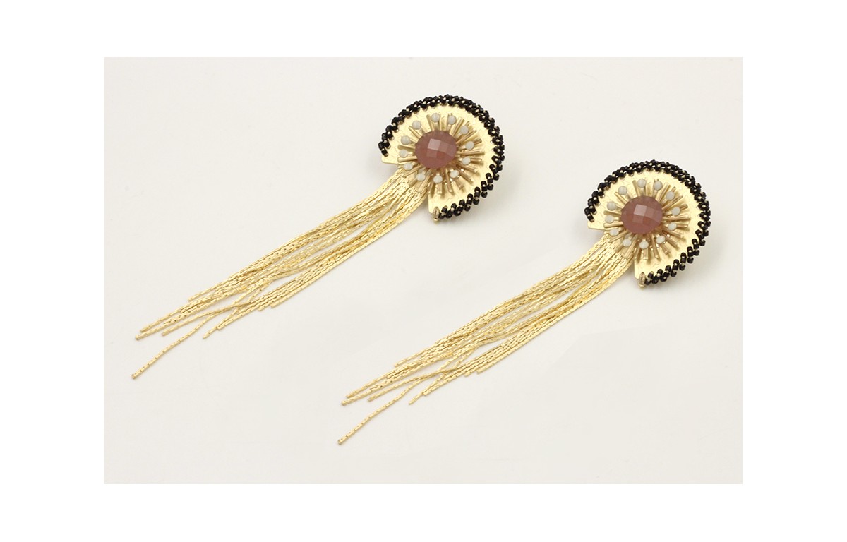 Pendientes medusa, semicirculo miyuki negro cosido,fleco dorado y roseton con brillo morado opal. Largo 14cm.