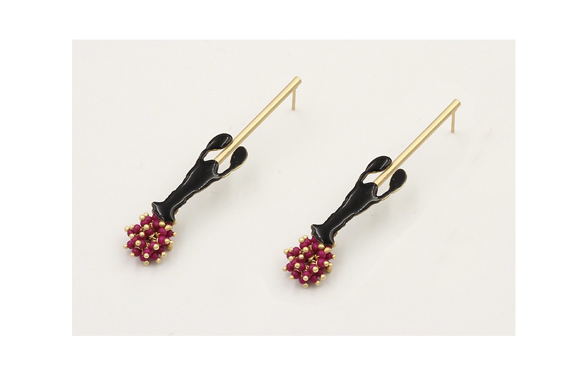 Pendientes perno palo dorado mate con langosta esmaltada negra y burruño abalorio morado. Largo 6cm.