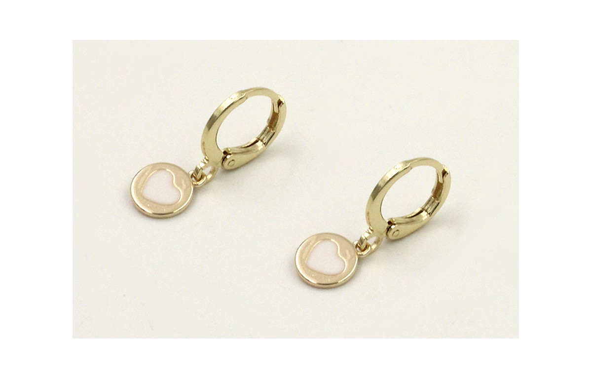 Pendientes cierre aro dorado con chapita corazón blanco colgando. Largo 2cm.