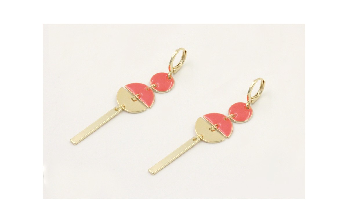 Pendientes cierre aro dorado con disco 2 agujeros coral, semicirculos coral y dorado con listón dorado. Largo 6cm.