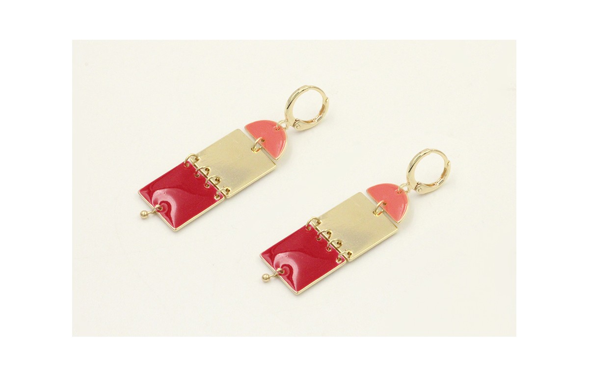 Pendientes cierre aro dorado con semicirculo esmaltado coral, cuadrados dorado y esmlatdo rojo rematdo en bolita. Largo 4cm.