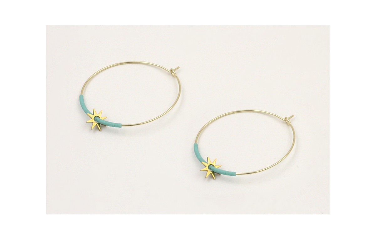 Pendientes de acero inoxidable aro grande estrella 7mm y miyuki color menta. Largo 4cm.