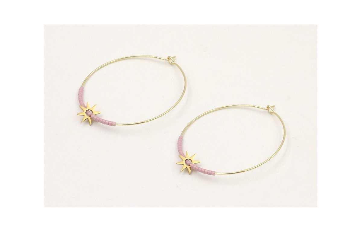 Pendientes de acero inoxidable aro grande estrella 7mm y miyuki color lila. Largo 4cm.
