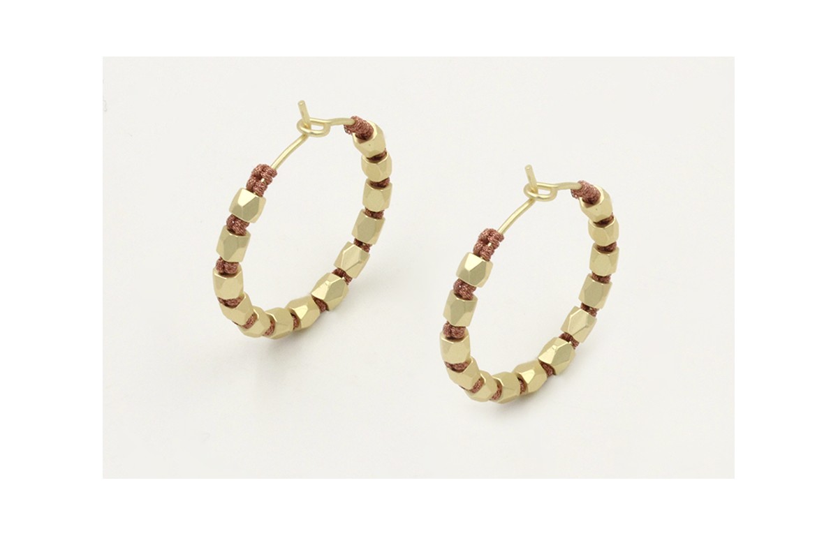 Pendientes aro con facetadas doradas mates cosido hilo oro rosa medio nudo macramé. Largo 2,5cm.