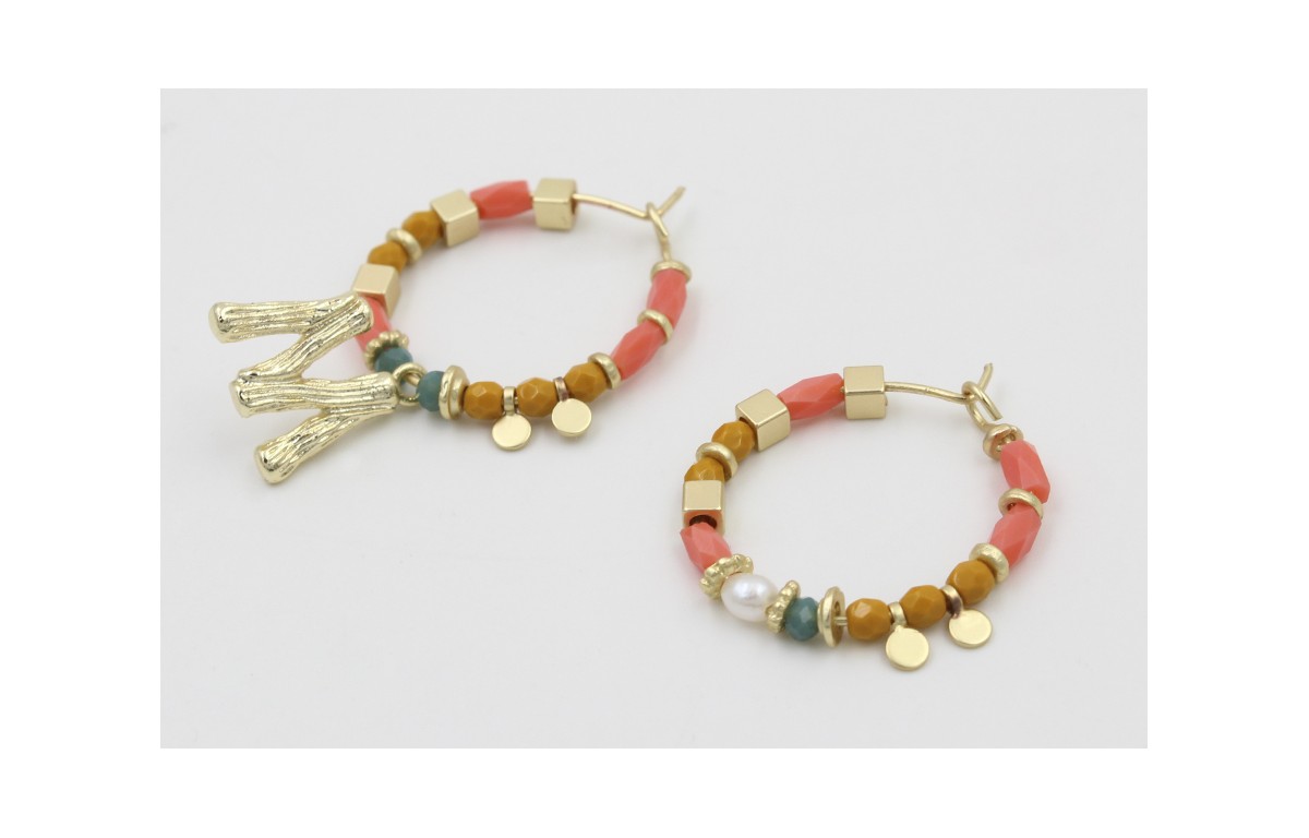 Pendientes aros con tubos facetados salmón, bolas mostazas,azul, cubos y entrepiazas dorado mate con letra M.