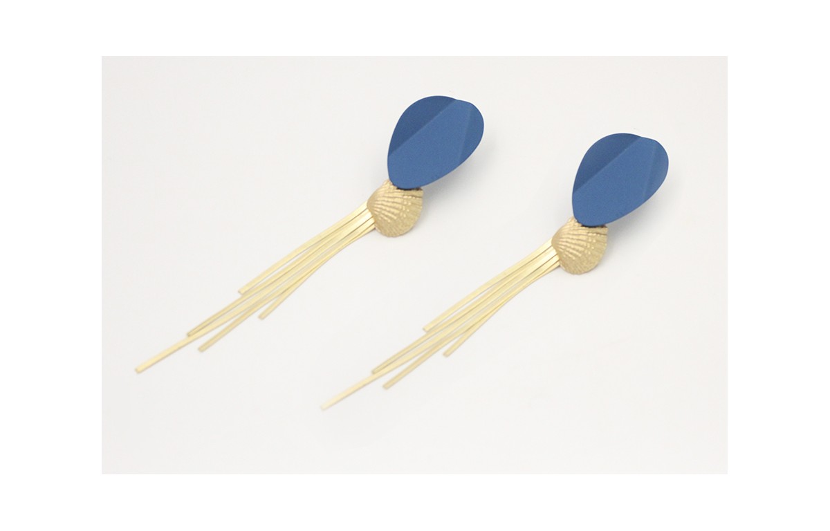 Pendientes Perno doblado azul con colgante de almeja y fleco en oro mate. Largo 13cm.