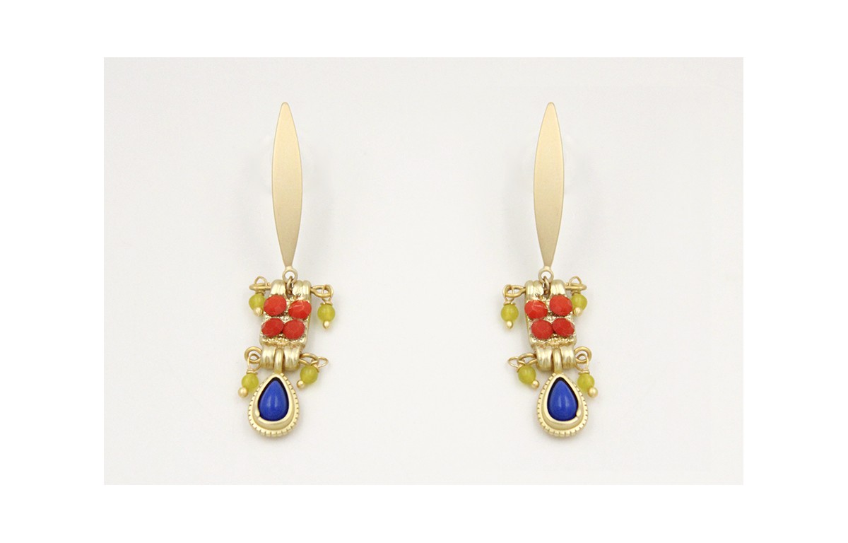Pendientes perno lamina ovalada oro mate con entrepieza con brillos coral colgando y gota piedra azul. Largo 4,5cm.