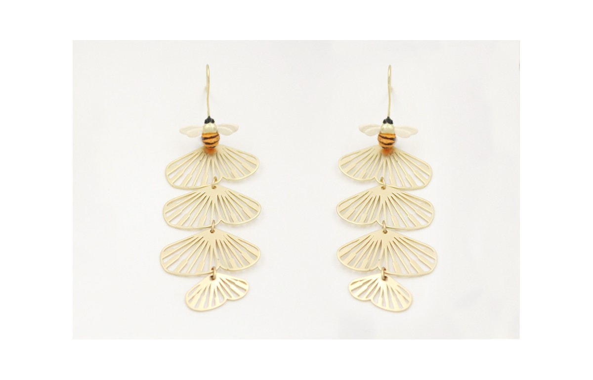 Pendientes perno de abeja pintada a mano con colgante de alas de mariposa. Largo 8cm.