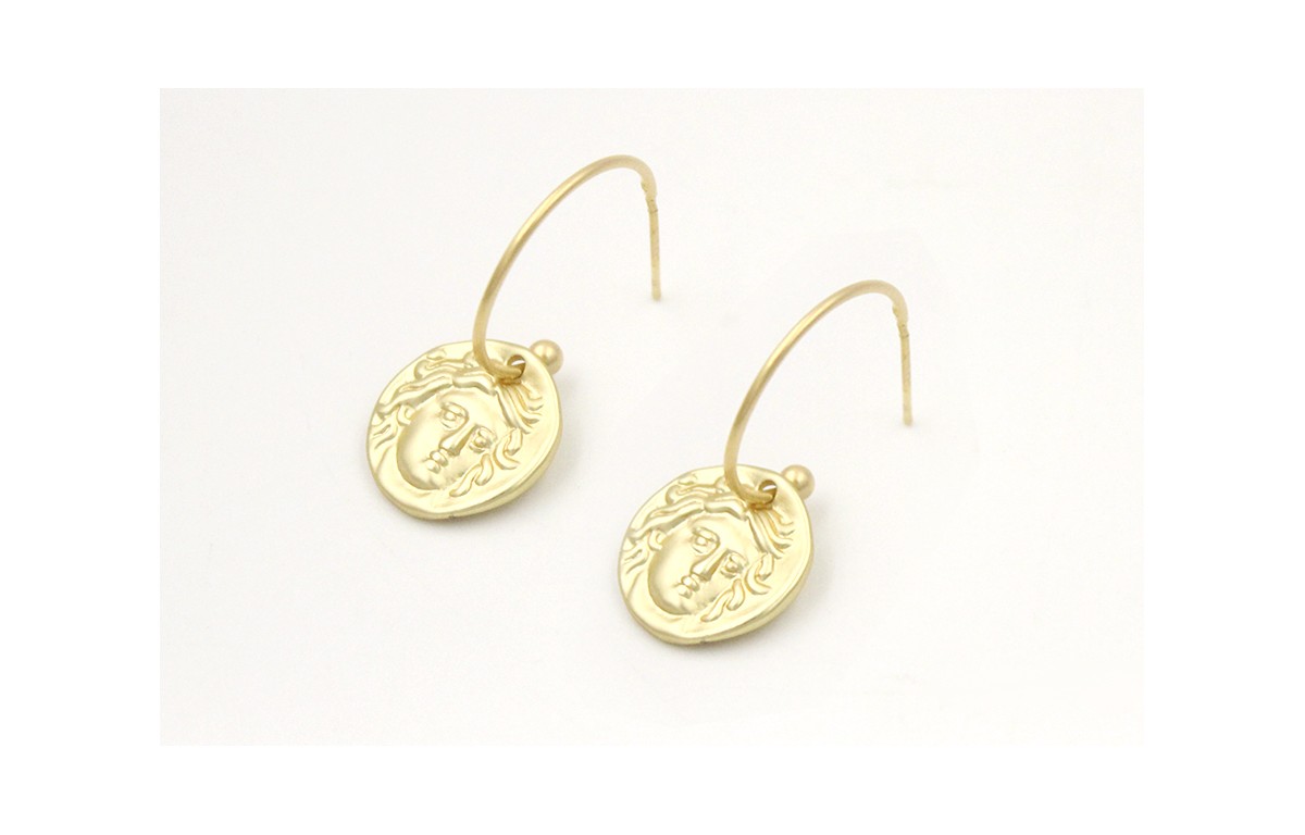 Pendientes aro con bolita en oro mate y colgante chapa romano. Largo 3cm.