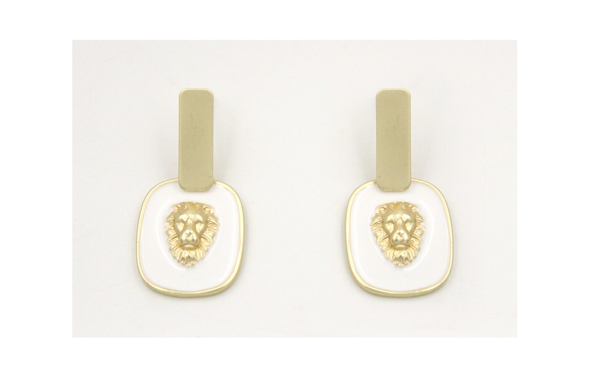 Pendientes perno listón plano oro mate con colgante chapa esmaltada blanca con cabeza león dorado. Largo 3,5cm.