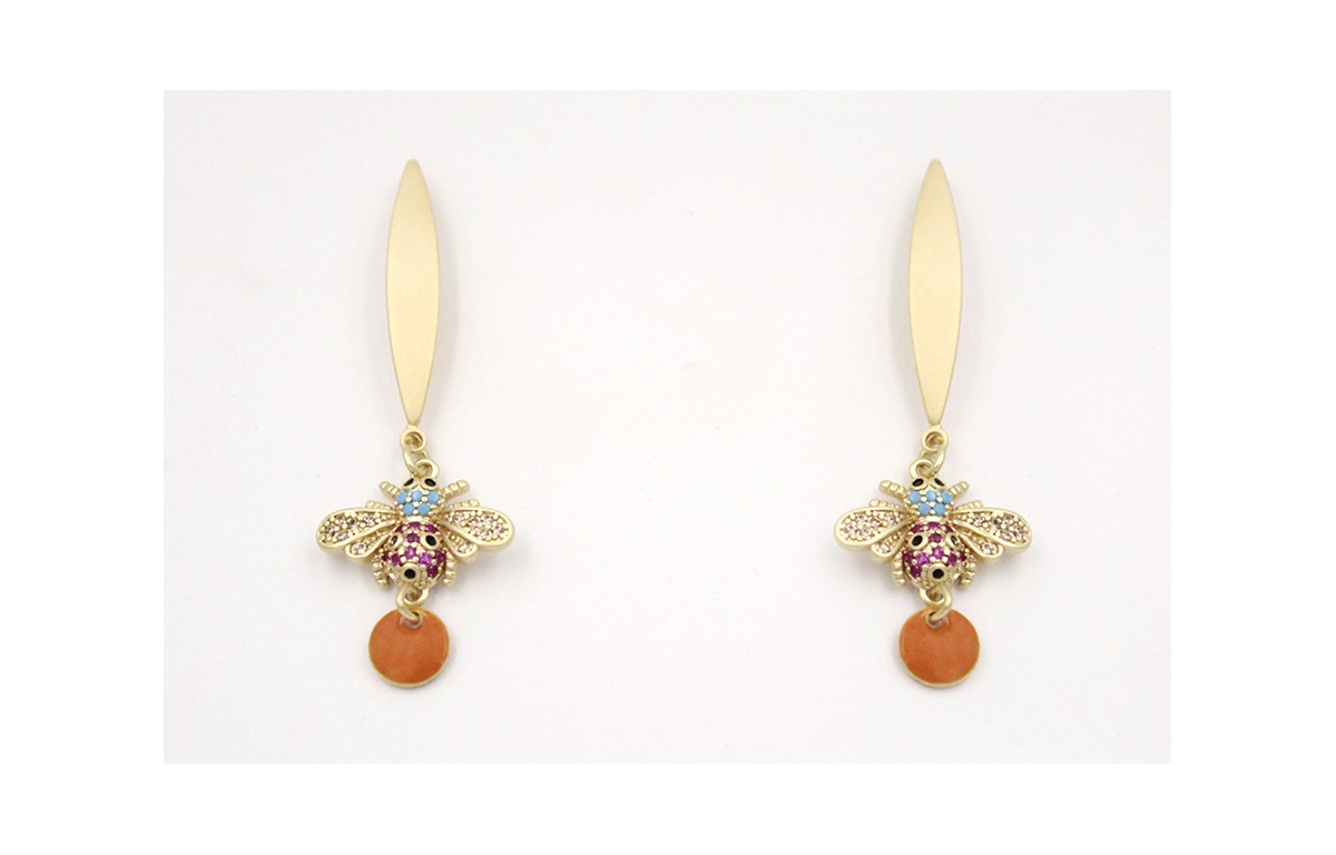 Pendientes perno lámina ovalada curvada con colgante de abeja con microbrillos y esmalte naranja. Largo 4,5cm.