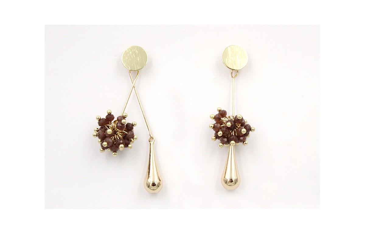 Pendientes irregulares con perno disco dorado con colgante pendulo dorado y burruño facetadas marrones. Largo 5cm.