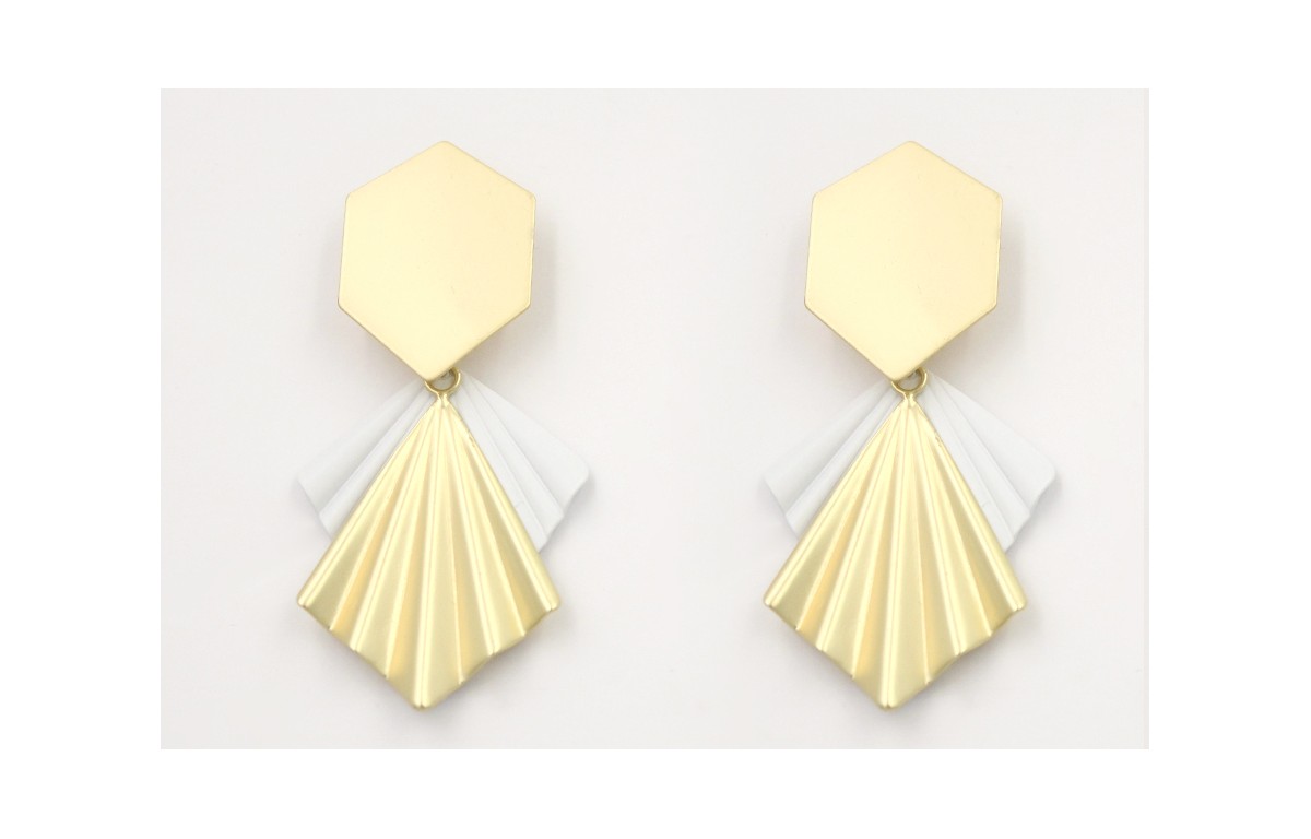 Pendientes perno hexágono dorado con colgante triángulo aro oro mate y triangulo ondas esmaltado blanco mate. Largo 6cm.