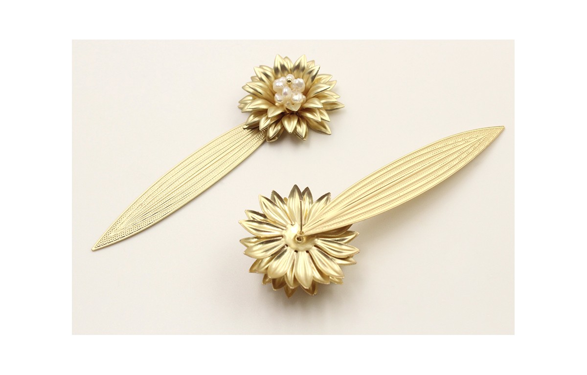 Pendientes nenufar 4 capas con bola de perlas y colgante hoja alargada dorada mate. Largo 7cm.