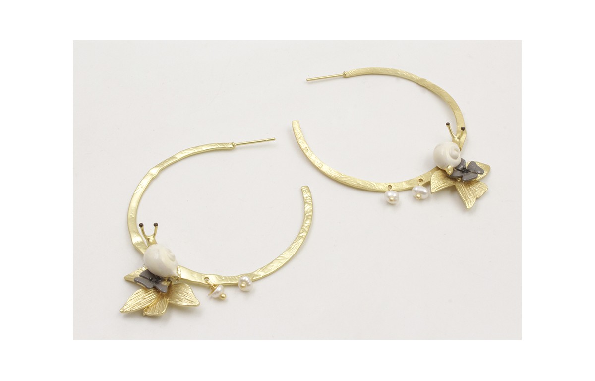 Pendientes aro plano labrado con caracol esmaltado beige, colgante 4 hojas, perlas naturales y flor esmaltada gris. Largo 6cm.