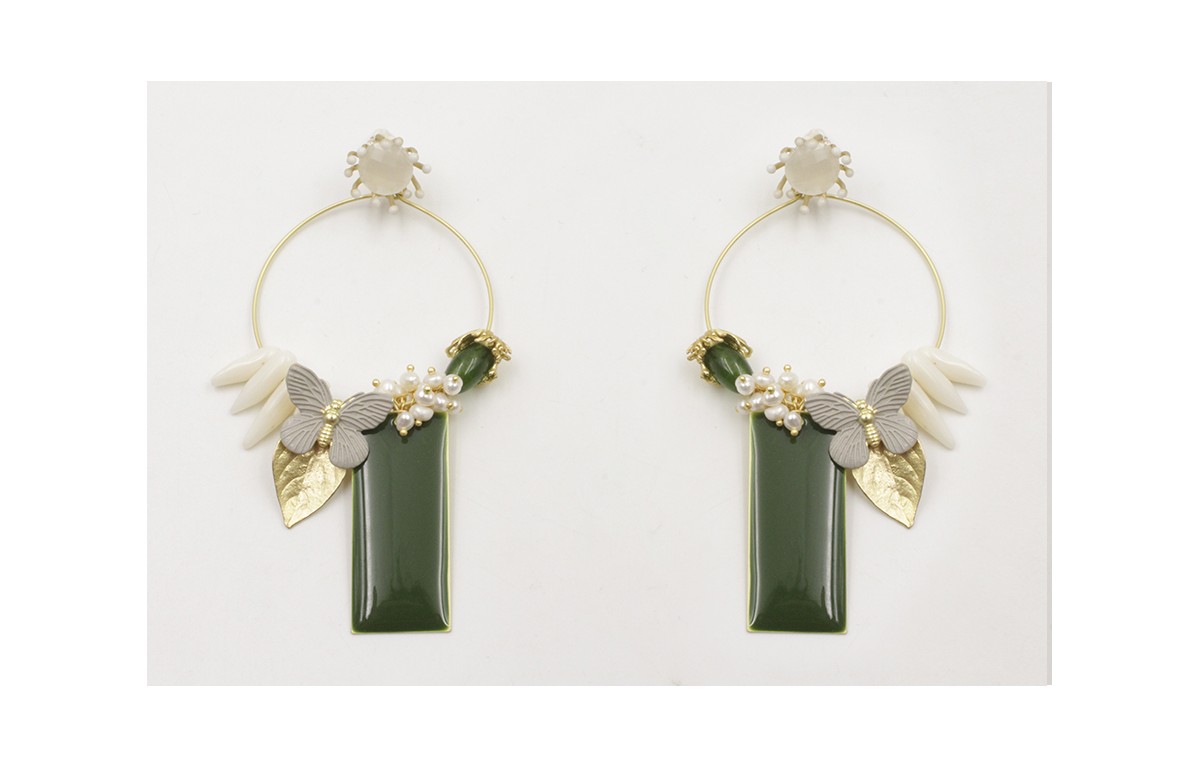 Pendientes perno de pistilos grises con brillo blanco opal colgante aro grande con rectangulo verde,mariposa gris,hoja dorada mate,burruño perlas naturales,casquilla dorada mate.Largo 10cm.