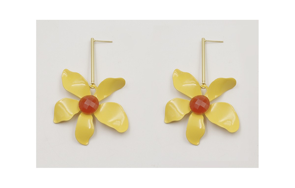 Pendientes perno pivote dorado mate con colgante flor esmaltada mostaza y brillo naranja opal. Largo 7,5cm.