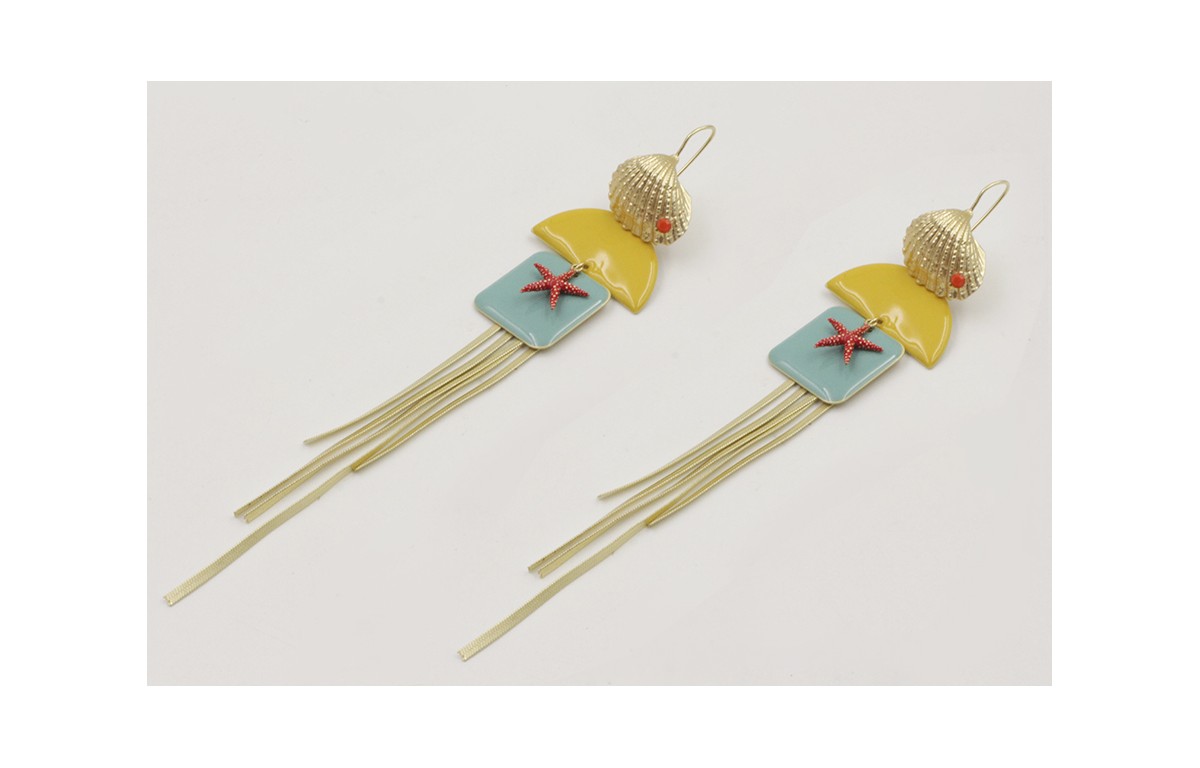 Pendientes perno concha con brillo coral, colgante semicirculo mostaza,cuadrado azul,estrelle de mar roja con fleco cadena plana. Largo 15cm.