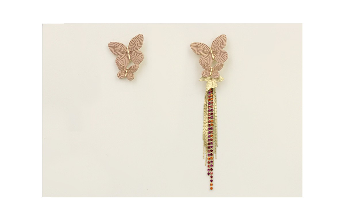 Pendientes irregulares perno mariposas rosas palo con fleco dorado mate y strass rosa,naranja,morado. Largo 12cm.