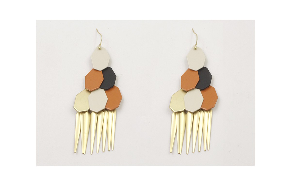 Pendiente perno gancho con hexágonos beige,dorado mate,teja y cuñas doradas mate. Largo 6cm.