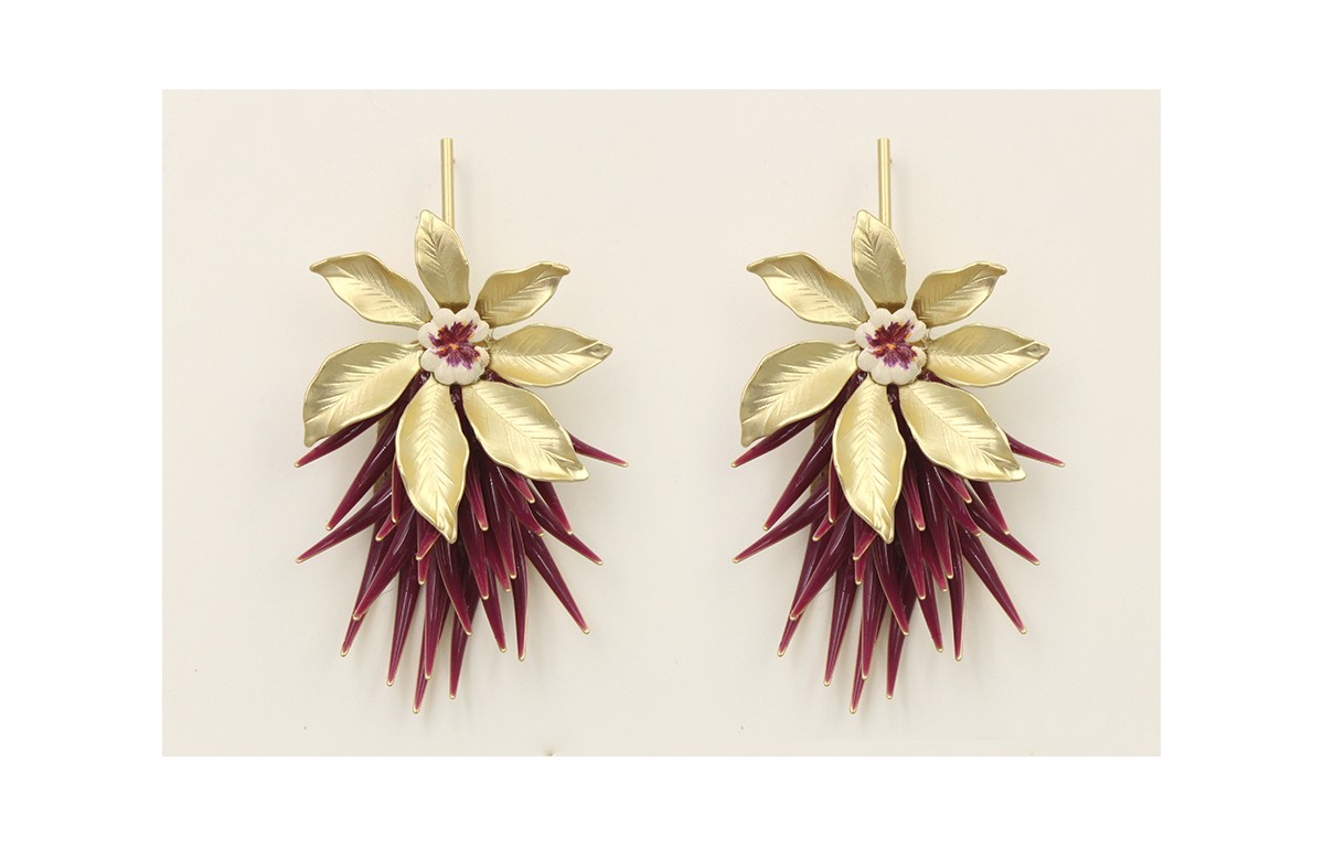 Pendientes perno pivote dorado mate con flor 7 pétalos dorada mate,flor blanca,morada,naranja y cuñas esmaltadas cardenal. Largo 9cm.