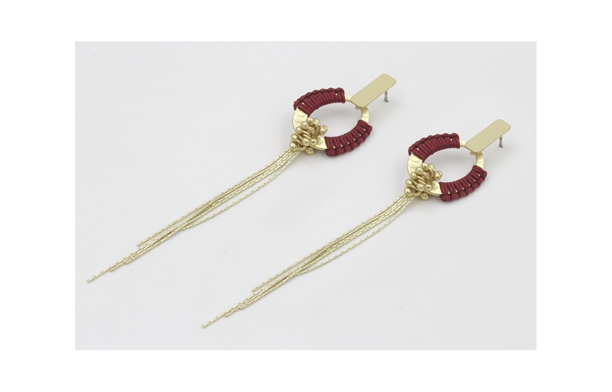 Pendientes perno rectangulo plano dorado mate con anillas plasnas forradas de hilo granate,bolitas y fleco dorado mate. Largo 11cm.