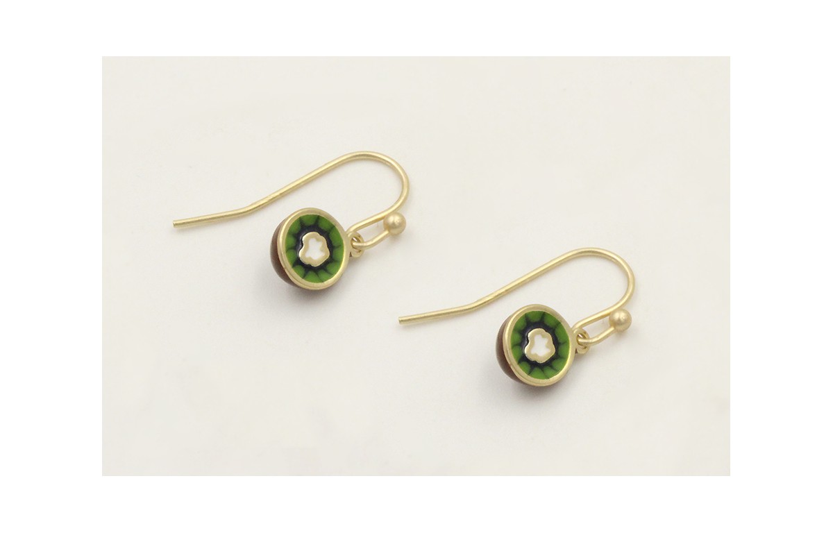 Pendiente de gancho sencillo oro mate con colgante de kiwi esmaltado.