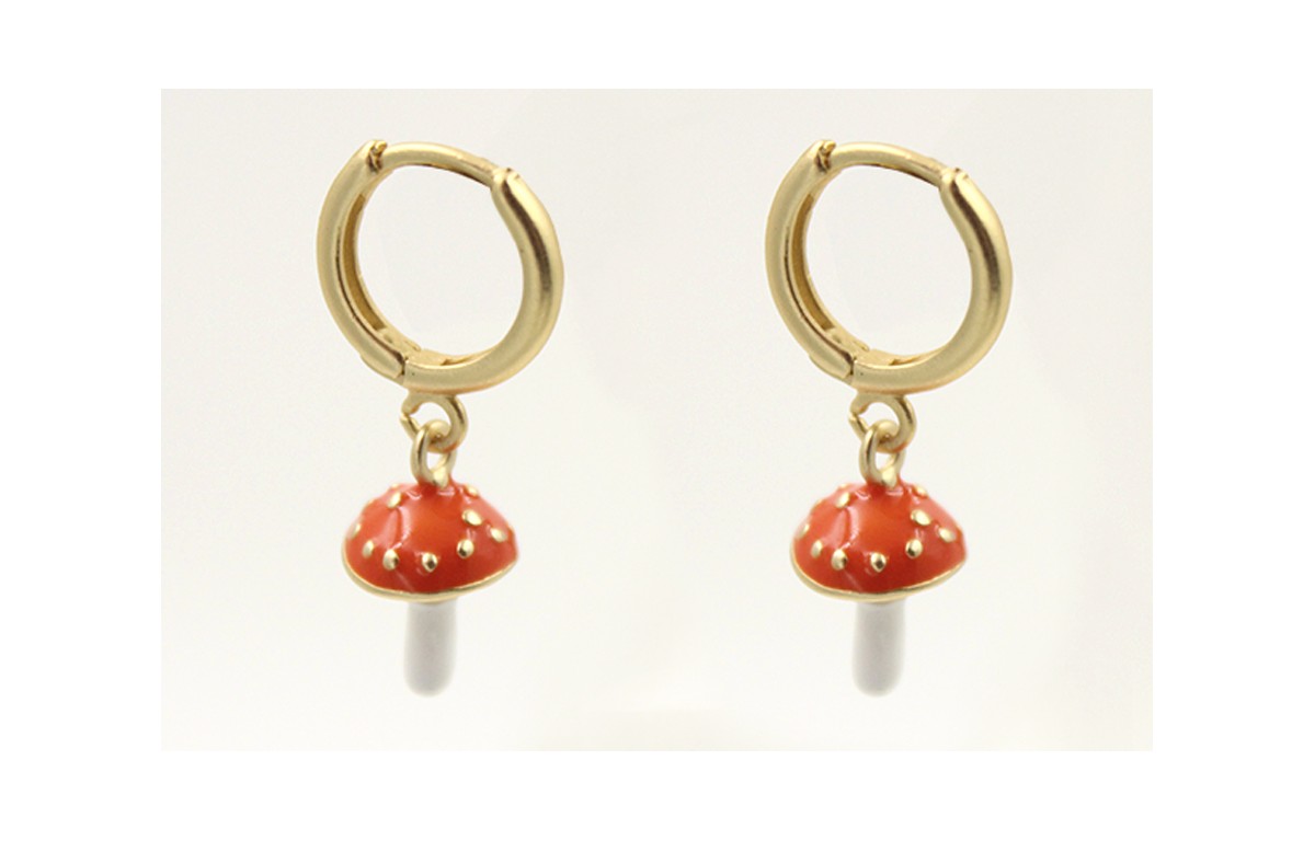 Pendientes perno de seguridad oro mate con colgantes de setas esmaltadas naranja.