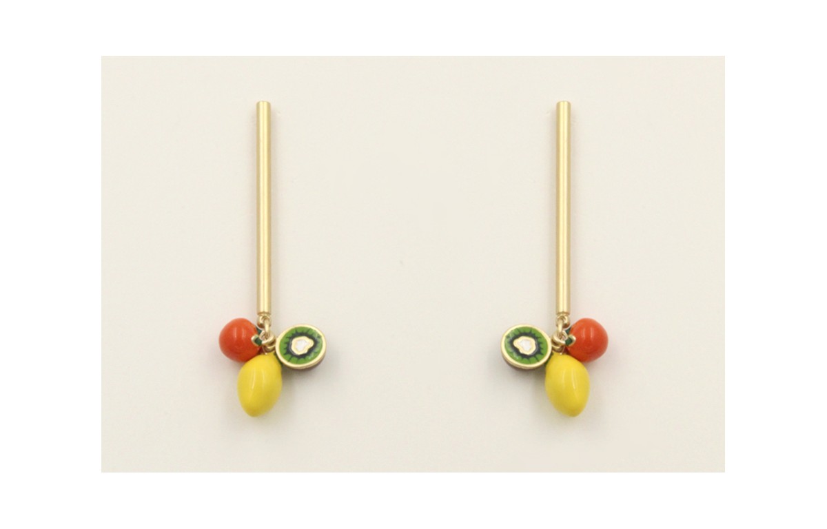 Pendientes perno palo dorado mate con limones, naranjas y kiwis esmaltados. Largo 5cm.