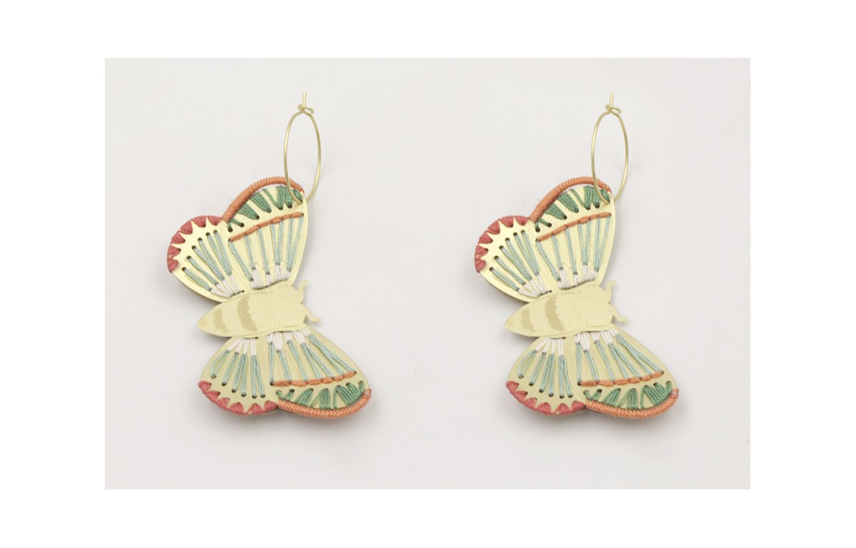 Pendiente con perno gancho sencillo oro mate con tucanes esmaltados verde con margaritas esmaltadas y cadena de strass coral. Largo 13cm