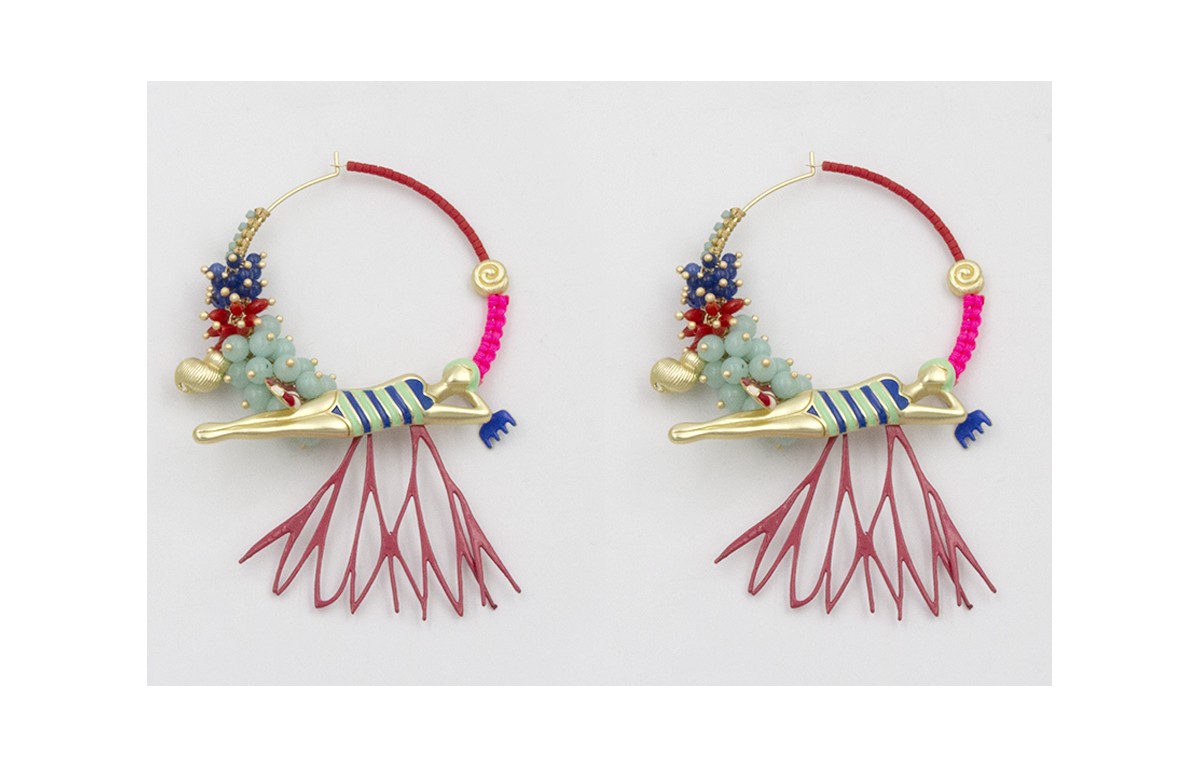 Pendientes aro dorado mate grande con miyuki rojo, nudo macrame fucsia, rama coral rosa, gamba roja y blanca, bañista azul, rastrillo azulón,caracolas doradas mates,burruño bolas semipreciosas,