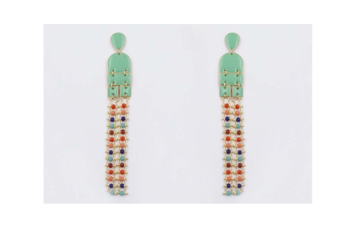 Pendientes perno gota, colgantes semi ovalo, cuadrados y rectangulos esmaltados en turquesa con fleco cadena de facetadas rojas,azules,salmón, turquesas.Largo 10cm.