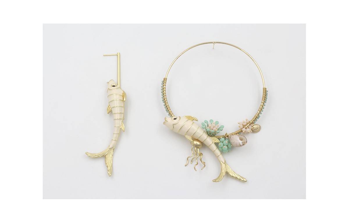Pendientes asimetricos perno listón dorado mate con pez esmaltado crema y maxi aro dorado con medusa dorada mate,burruños facetadas opal y turquesa, almeja, pez crema,caracola,casquilla turquesa.