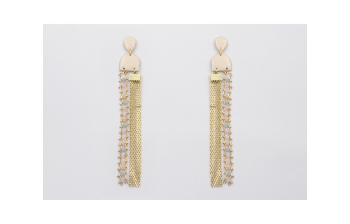 Pendientes perno gota, colgantes semi ovalo esmaltados en rosa claro con fleco cadena de facetadas opales. Largo 11cm.