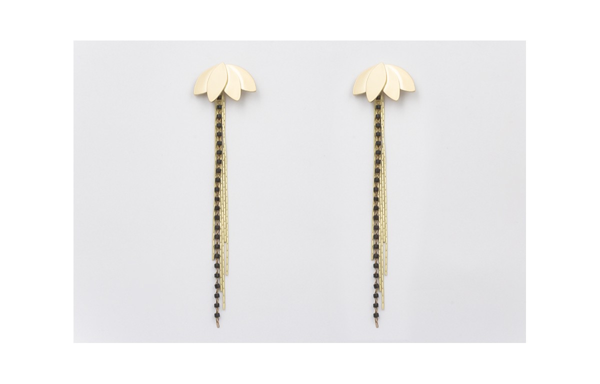 Pendientes perno flor de lotto dorado amte con fleco cadena miyuki negro y fleco dorado mate. Largo 9cm.